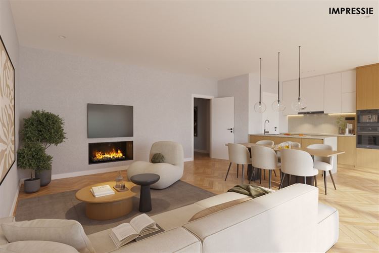 Je komt binnen via een ruime inkomhal met ingebouwde vestiarekasten, die ook dienstdoet als nachthal. Van hieruit bereik je de lichtrijke leefruimte van 30 m² met aansluitend de keuken (dewelke (makkelijk en) op de impressie open werd gemaakt). Naast de keuken is er een handige berging, ideaal voor extra stockage.