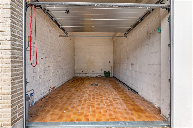 Op het gelijkvloers bevindt zich een privatieve garage met bijhorende autostaanplaats op de oprit. Deze is verplicht bij aan te kopen voor €30.000 en beschikt over aansluitingen voor water en elektriciteit.