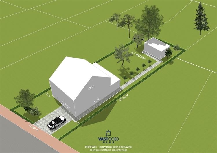 De bebouwbare zone voor het hoofdgebouw meet 11,27 meter breed en 17 meter diep, ideaal om een woning op maat te ontwerpen. Daarnaast is er plaats voorzien voor bijgebouwen binnen de aangeduide bouwstrook, met een minimumafstand van 10 meter tussen de achtergevel en de perceelsgrens. In totaal mag er tot 75 m² aan bijgebouwen worden opgericht, perfect voor een garage, tuinhuis of hobbyruimte.
