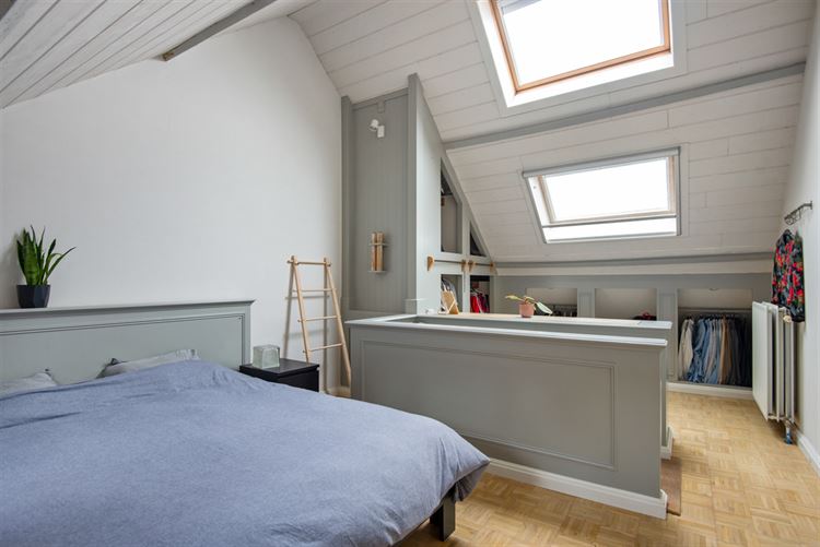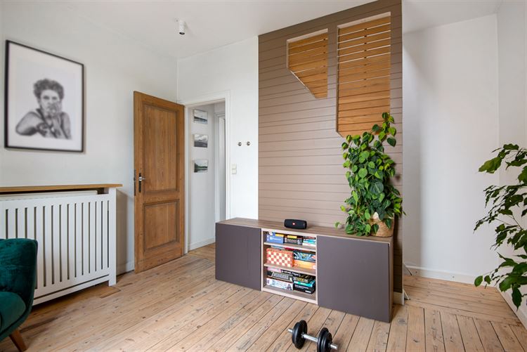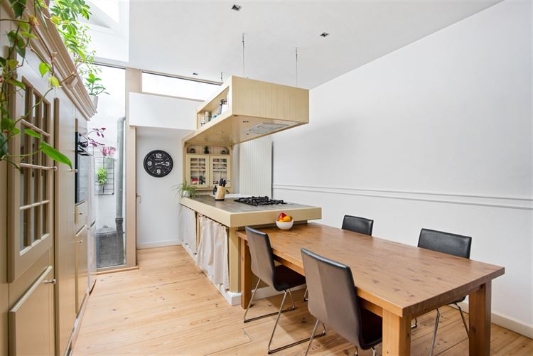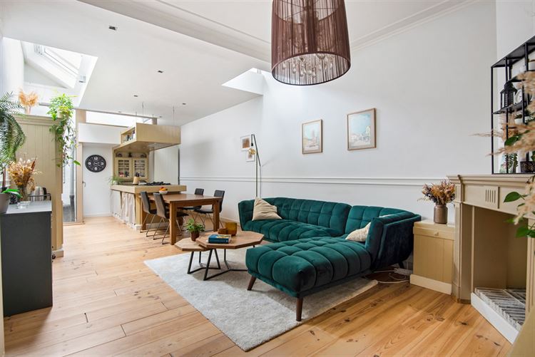 De gezellige leefruimte met open keuken is het kloppende hart van de woning. Dankzij de houten vloeren, hoge plafonds, subtiele moulures en slim geplaatste lichtstraten geniet je er van een warme, huiselijke sfeer en overvloedig daglicht de perfecte plek om te ontspannen of gasten te ontvangen.