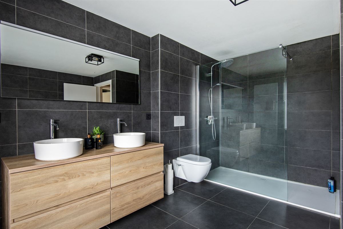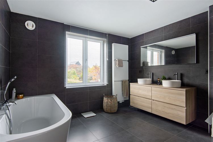 De ruime badkamer is smaakvol ingericht met zowel een ligbad als een inloopdouche.